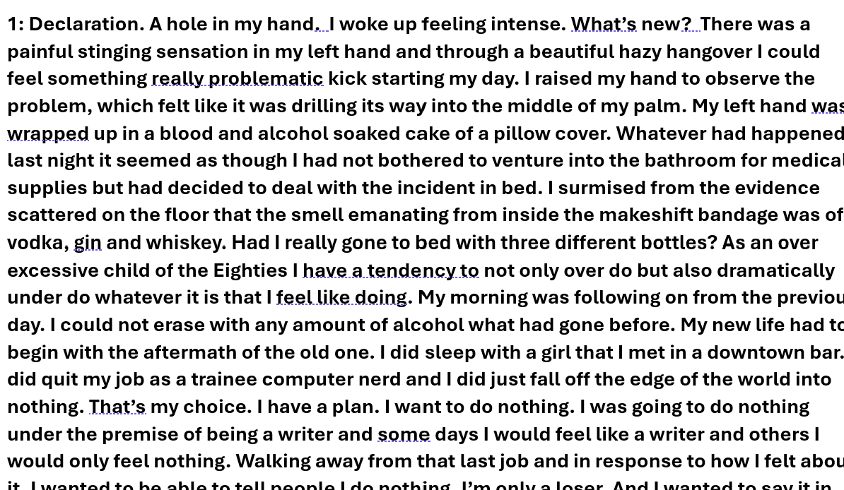 Slowly, the nails holding me down come loose and I roll on the floor a little before I get up. I wake up to apathy, maybe a little total anorexia. Stuffed with the urge to do nothing, I pick a tape at random and load it into the stereo. I pick Beth Orton and press play and then think about looking out the window but I instead turn to the computer. As I turn it on and wait for it to boot up I stare at the monitor. I watch it go through the regular process and watch all the words and icons flick into life. With everything sitting on the desktop where it should be, all I can do is stare through the bright blue screen. I don’t know what the feeling is, maybe a little disinterest in everything. Usually the total anorexia thing comes about because I really want to do something but can’t care for anything, nothing feels right. Mix it up with apathy and you get a desire to do nothing and yet nothing seems desirable. The most that you can hope for if this hits you is for it to pass quickly (not likely) or to find a comfy spot to dwell in whilst the anorexic apathy monster runs riot in your apartment (possibly the best case scenario but often most unlikely). Most often you squirm in a hundred different uncomfortable positions. I had fallen on to the bed in a curled up heap but lying there for only minutes I had begun to feel weird. The weirdness pervaded from my mind to my body and I was left feeling physically uncomfortable by the fast spreading feelings. I slid off the side of the bed, feeling like a cracked raw egg sliding down a wall. I dragged my face across the sheets and pillows and got to a slouched position on the floor from where I could mount an effort to stand. I stood up and lazily grabbed the TV remote. I toyed with it. TV would bw a welcome distraction, an opoate to fill my day. I’m way too young to wish the days away, wish your life away, waiting for nothing and everyone wants to sing about pink houses but no one wants to live in them, well, ain’t that A